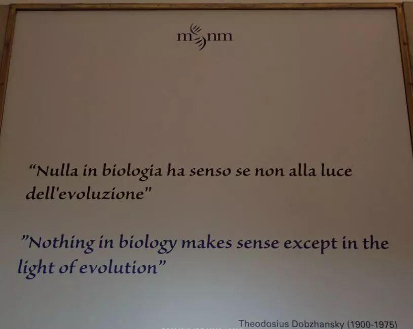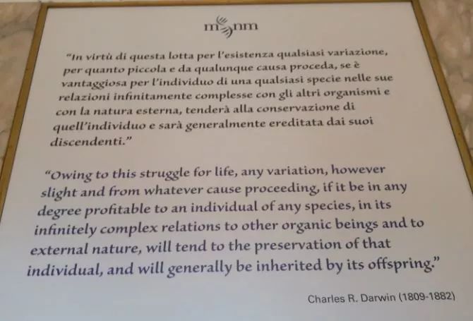 进门后,售票处的左右两侧门拱上分别有着美国生物学家杜布赞斯基和英国伟大学者达尔文的名言。之后的参观中也时时可以感受到米兰自然博物馆正是依演化的思路,展示着生物界的多样与变化。