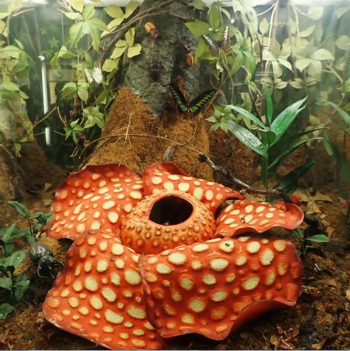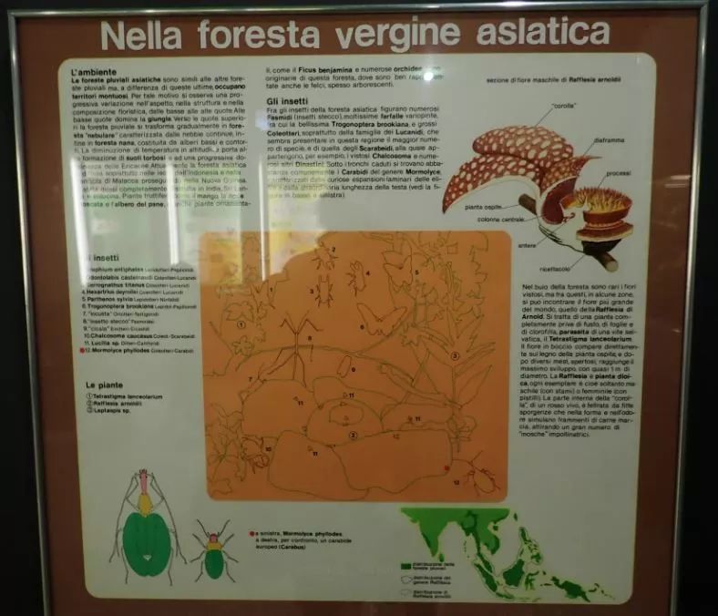 全馆共有23个大小不一的展厅,一楼是矿物、化石、恐龙、脊椎动物演化、无脊椎动物和昆虫。米兰自然博物馆采用了大量被称作“立体透视模型”(diorama)的形式来进行展示。比如,下面这个亚洲热带丛林林下植被的场景,中心是一朵大王花(Rafflesia spp.),周围是各种甲虫、竹节虫和蝴蝶等昆虫。旁边还附有图解,指示对应的各物种名称,通常还会附有表示解剖结构的插图。直观又不失生动,就是说明全是意大利语的...