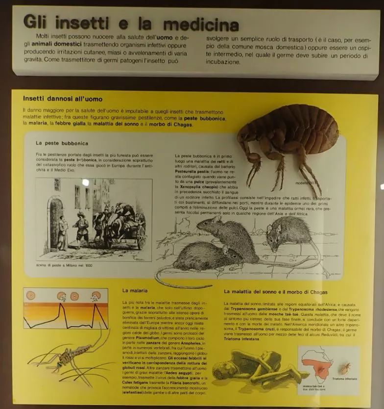 除开场景还原式的展示,还有结合模型、文字和图画这样较为传统的形式。比如下面这个介绍媒介昆虫与人类疾病,其中就有中世纪席卷欧洲的可怕“黑死病”。现在一般认为,这场瘟疫是由跳蚤传播的鼠疫杆菌所致。
