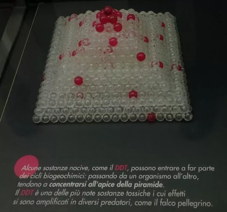 总体感觉,这家博物馆在把概念和知识点具象化上花了不少心思。比如,下面这组介绍食物链/网和生物富集作用的展示,“无形”的食物网和DDT随着食物链逐渐聚集的情况可谓一目了然。