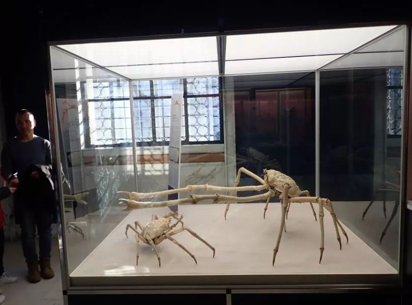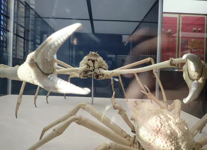 除此之外,一楼还有些很有意思的展品。比如,现生体型最大的甲壳动物——甘氏巨螯蟹(Macrocheira kaempferi)。它的附肢完全伸展开,最长的量度可达4m,主要分布于日本列岛周围海域水深150-300m的地方。跟凶悍的外表相反,它们是生活在海底移动缓慢的食腐者。