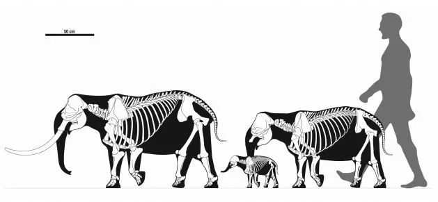 欧洲矮象的体型大小,从左至右依次为成年雄象,幼象和成年雌象,作为参照物的人身高为1.8m。今天有观点认为在西西里岛和马耳他岛上发生的象科成员侏儒化可能并不止一次,欧洲矮象也包含了两种或以上的种类,引自Larramendi et al. 2015.