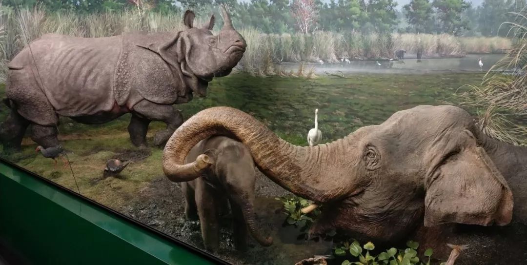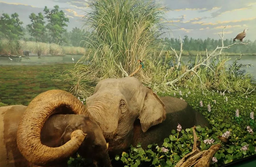 14展厅南亚次大陆场景(原型为印度阿萨姆邦加济兰加国家公园),停在枝头的白胸翡翠和灰头渔雕,水中的亚洲象母子,岸边昂着头的大独角犀、紫水鸡和大白鹭,背景中的象草丛、彩鹳,还原度可以说是非常之高了。展示的这头亚洲象是曾生活在米兰动物园里的母象“孟买”(Bombay),1987年去世后被制成标本。动物园已于1992年关闭,而曾给米兰人留下过深刻印象的“孟买”,如今以另一种形式继续让参观者惊叹不已。