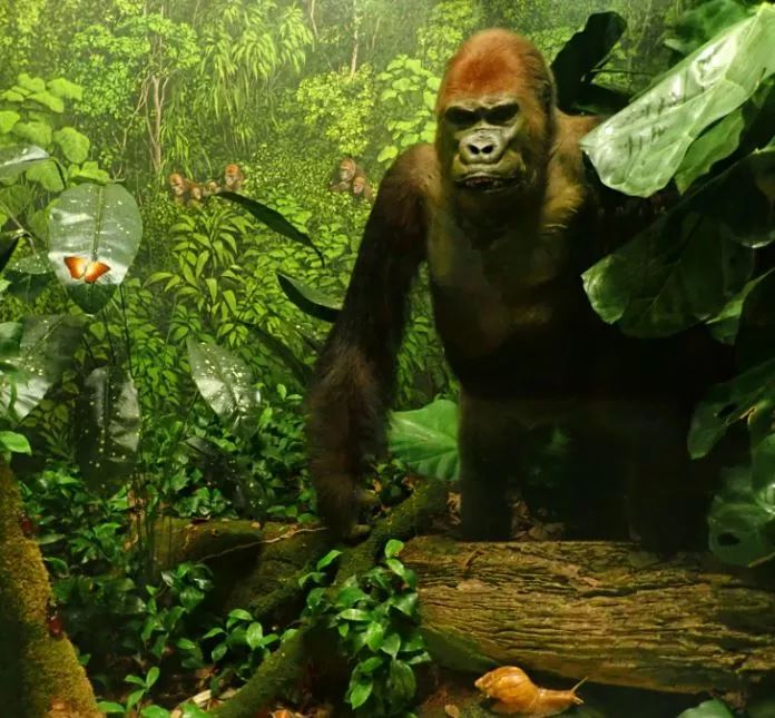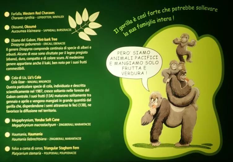 15展厅加蓬低地雨林场景,西部大猩猩指名亚种及其生活环境,这是2017年新完成的作品,这些新的展示往往还配有非常童趣的漫画。借助了谷歌翻译,上面那句的大意是银背非常强壮,可以托起全家人。下面对话框里那句则说大猩猩是爱好和平的素食者。想更多了解大猩猩,请参阅徒步看山地大猩猩是个什么感受?(上)