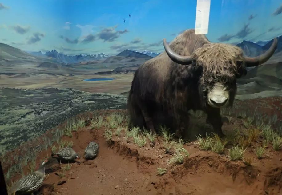 16展厅青藏高原羌塘草原场景,高寒环境下的生物多样性是赶不上前面的雨林,展示的细节却一点儿都不含糊。印象最深刻的是蓝天里的那对渡鸦,其实就整个展示效果来说,一般参观者看起来它们就只是背景里的两个黑影,但绘者没有因为这样就放松要求,而认认真真地去画了两只渡鸦(注意翅形和楔状的尾羽)!藏羚的雄性集群,其实也只是侧壁上的一些点状物,但细看角的形状、冬季的毛色都表现得很到位。不能再赞了!