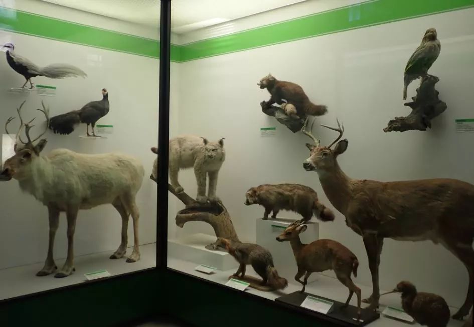 而在上述制作堪称十分精良的展示场景之间,则是传统的标本展柜。虽说传统,但也能给人以新知。比如,当看到下面这个温带针叶林展柜时,一度非常困惑为什么鸮鹦鹉(Strigops habroptilus)会跟小熊猫(Ailurus fulgens)和驯鹿(Rangifer tarandus)们同框?!随后才反应过来,鸮鹦鹉原本就是种生活在南半球针叶林里的鸟类嘛(想更多了解现生最大鹦鹉,请参阅:当一种鹦鹉仅存18只公鸟时,如何让它不灭绝?网红鹦鹉围观记)。