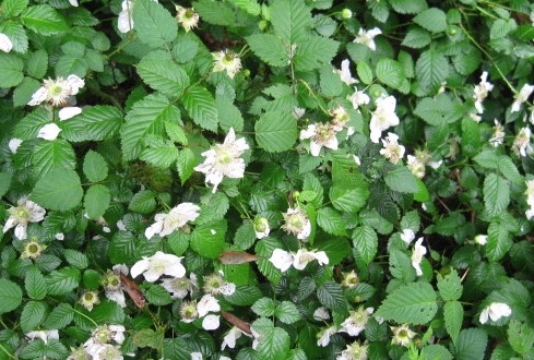 山道旁生长着许多开小白花的植物,是“覆盆子”吗?好像是。有些已经结子,是一种名贵的中草药呢。