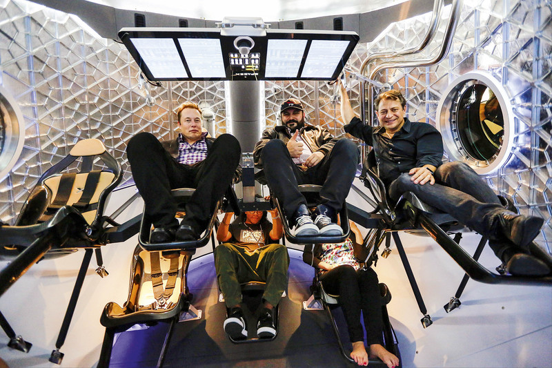 ( 2014年5月29日,埃隆·马斯克(左)的太空探索技术公司在美国加州霍桑市发布新开发的Dragon V2载人航天飞船,马斯克也进到飞船舱内亲身体验 )