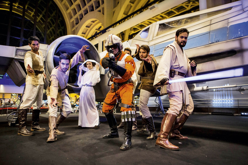 ( 1.2015年12月16日,在阿根廷首都布宜诺斯艾利斯,人们装扮成电影《星球大战》中的人物参加《星球大战7:原力觉醒》的首映式