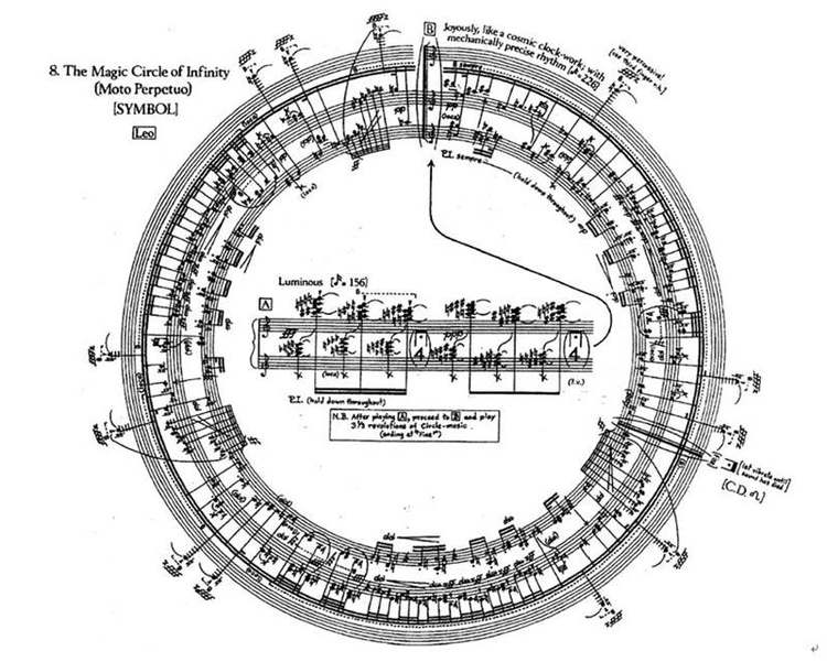 克拉姆为乐谱设计了许多不同造型,如圆形、双圆形、罗盘型等等,这些形状并非随意确定,而是根据不同作品的标题和意境进行的精心设计。