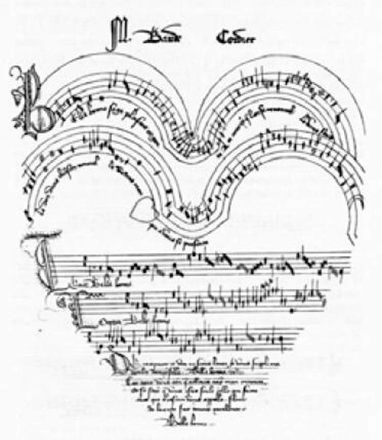 初次接触造型谱是在几年前的一个网页上,排成心形的“浮夸”乐谱令人惊讶不已。原本以为是恶搞,或单纯就是一幅结合了音乐元素的画作,尽管音符排列有模有样,还使用了格里高利圣咏的同款记谱法,但仍令人怀疑其作为乐谱的真实性。直到后来才知道这确实是一份正经乐谱——14世纪作曲家鲍德•科尔迪耶(Baude Cordier)创作的《美丽,善良,聪明》(Belle,bonne,sage)。