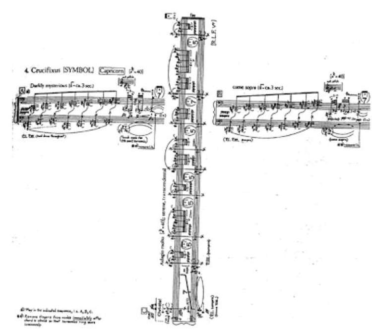 接触现代主义作品之后,更是看到了许多排成图案的乐谱,且形状更加多样,有圆形、双圆形、十字形、日字性、螺旋形等等,突然想起往日曾见过的心形乐谱或许也属同类,造型谱果真造型别致。