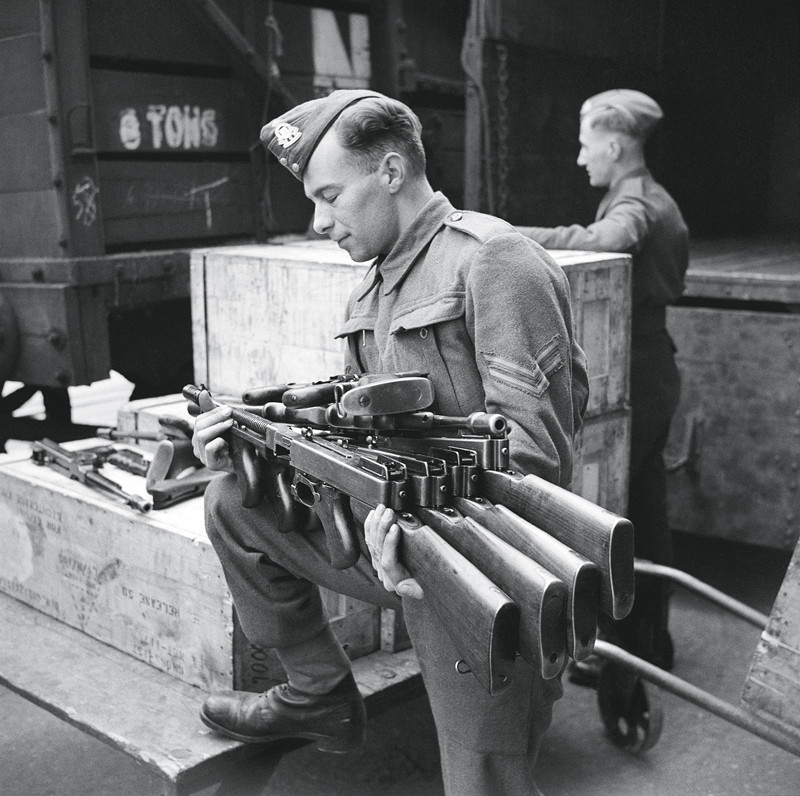 1942年3月23日,一名英军士兵在英格兰中西部的一处军用机械库领取美国援助的冲锋枪