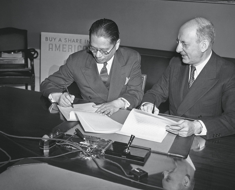 1942年3月22日,时任国民政府外长宋子文(左)和美国财长摩根索在华盛顿签署借款协定,美国将贷款5亿美元援助中国抗战