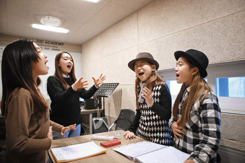 韩国女孩在上声乐课。为了能被大型艺人企划和经纪公司选中,必须经过严苛的训练,而更大的代价则有可能是辍学