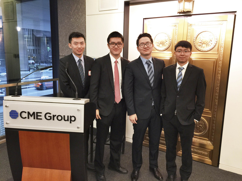 由四名中国学生组成的芝加哥大学代表队在2015年PRMIA世界风险管理挑战赛中获得芝加哥区域冠军。代表队成员:(左起)林无寒、冷麟阁、徐文泽、李扬帆