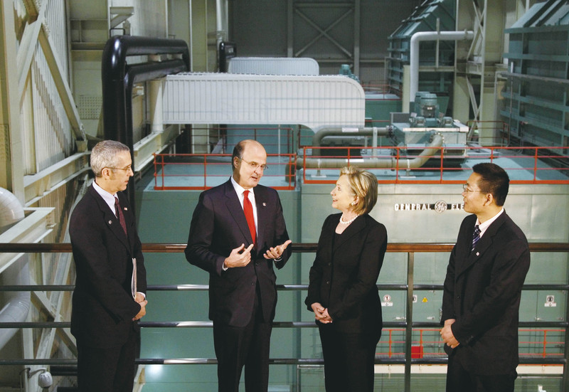 ( 2月21日,美国国务卿希拉里参观了北京能源投资(集团)北京太阳宫热电厂(左至右:美国气候变化问题特使斯特恩、GE大中华区总裁兼首席执行官罗邦民、希拉里和GE能源集团中国区总裁温跃忠) )