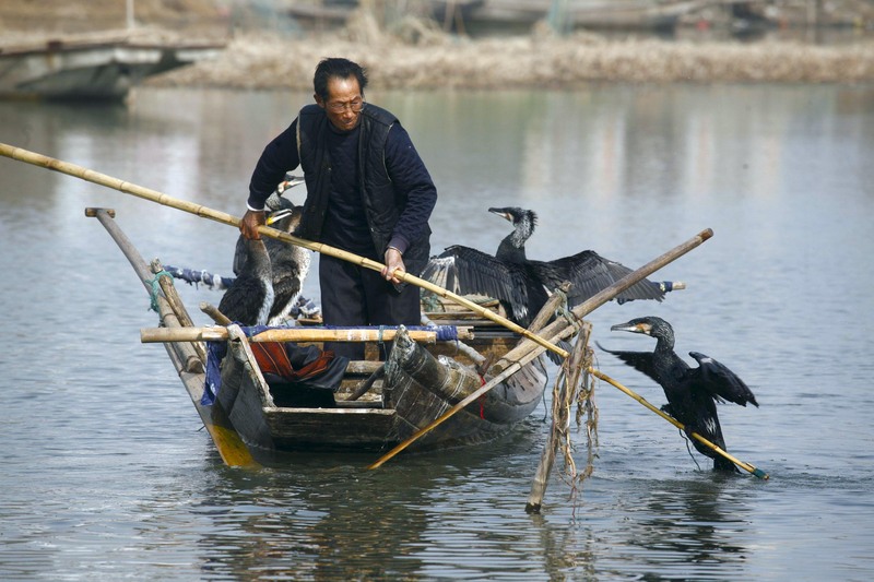 ( 洪湖市滨湖的三八渔场,一位渔民正在驯养鸬鹚捕鱼