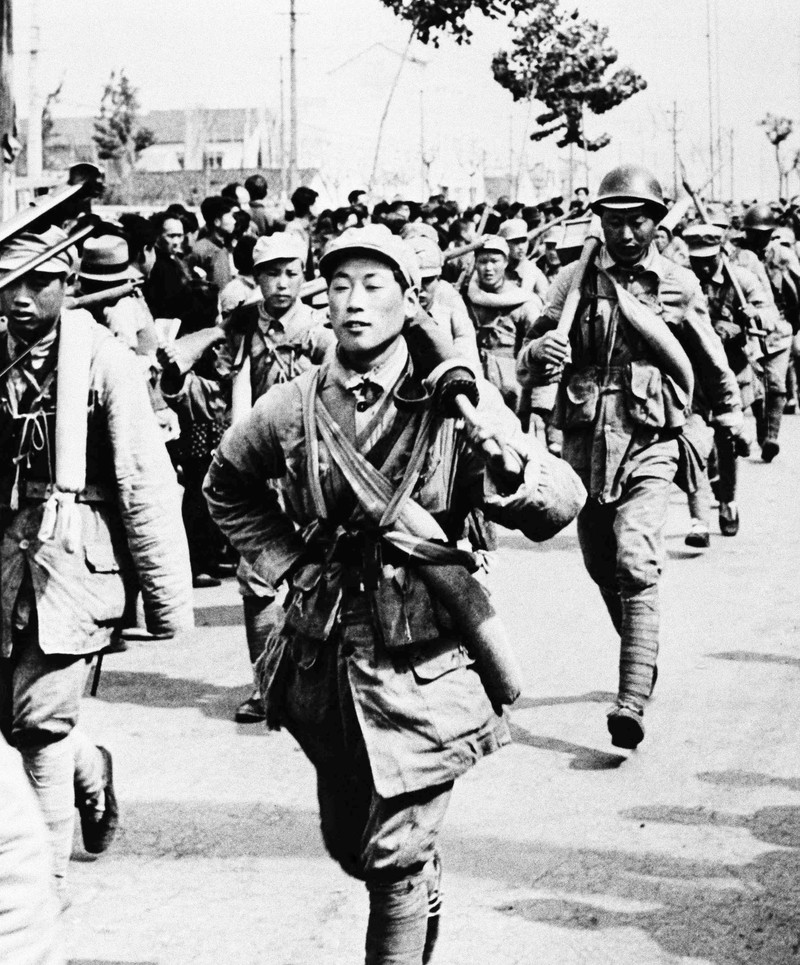 ( 1949年4月24日清晨,解放军部队进入南京市西门,行进在中山大道上 )