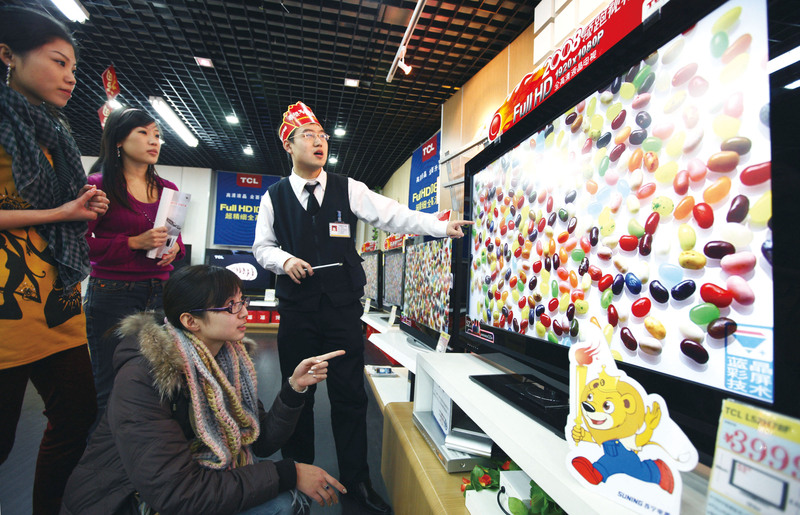 ( 苏宁电器卖场内的销售人员为顾客介绍液晶电视 )