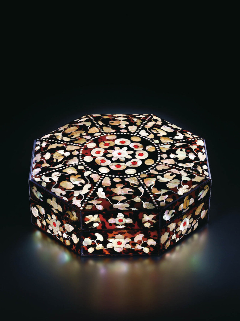 用来制作这个梳妆盒的玳瑁材料,极其珍稀,取自一种名叫玳瑁的海龟背部的鳞甲,这种海龟喜欢待在温带或热带海岸。它们背面鳞甲共38片,表面光泽,半透明浅黄地,黑褐色斑纹,甚为美观。腹甲13枚呈黑黄色,鳞甲片近圆形、三角形或多角形。当时的人十分珍爱玳瑁,除了它表面触感很好、质地半透明、花纹晶莹而错落有致,还因为它坚固且经久不坏,同时人们还认为它具有解毒功效。福建、台湾、海南岛和西沙群岛等地产有玳瑁。