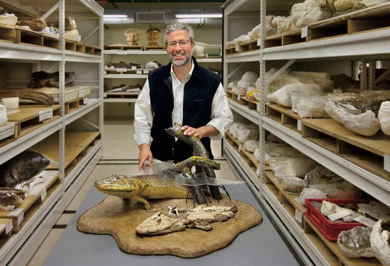 ( 芝加哥大学教授尼尔·舒宾和半鳍半肢淡水鱼Tiktaalik化石 )