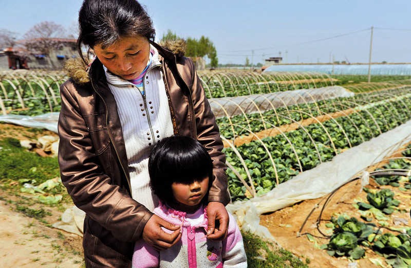 4月19日,韩丽霞和小女儿站在自家的卷心菜地前,这里再也见不到男主人劳作的身影 )