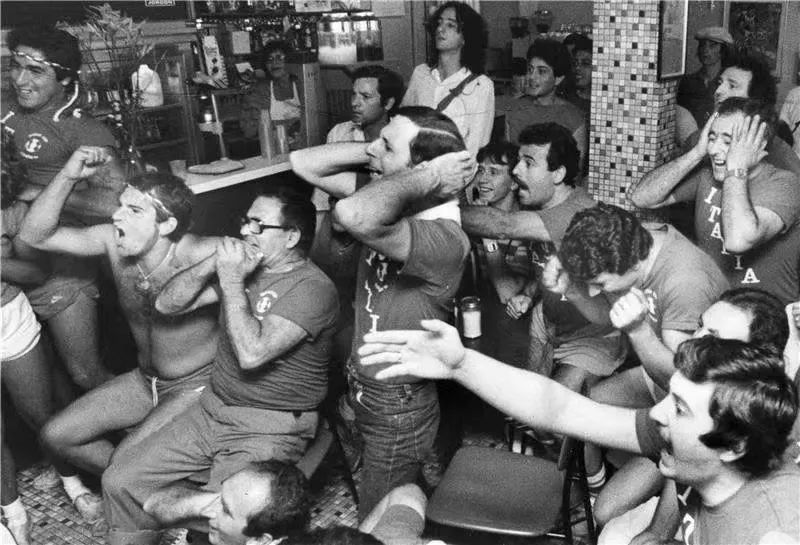 小小的电视屏幕让足球这项运动的影响力大大扩散了出去。图为球迷聚集在电视前观看比赛(摄于1982年7月11日)