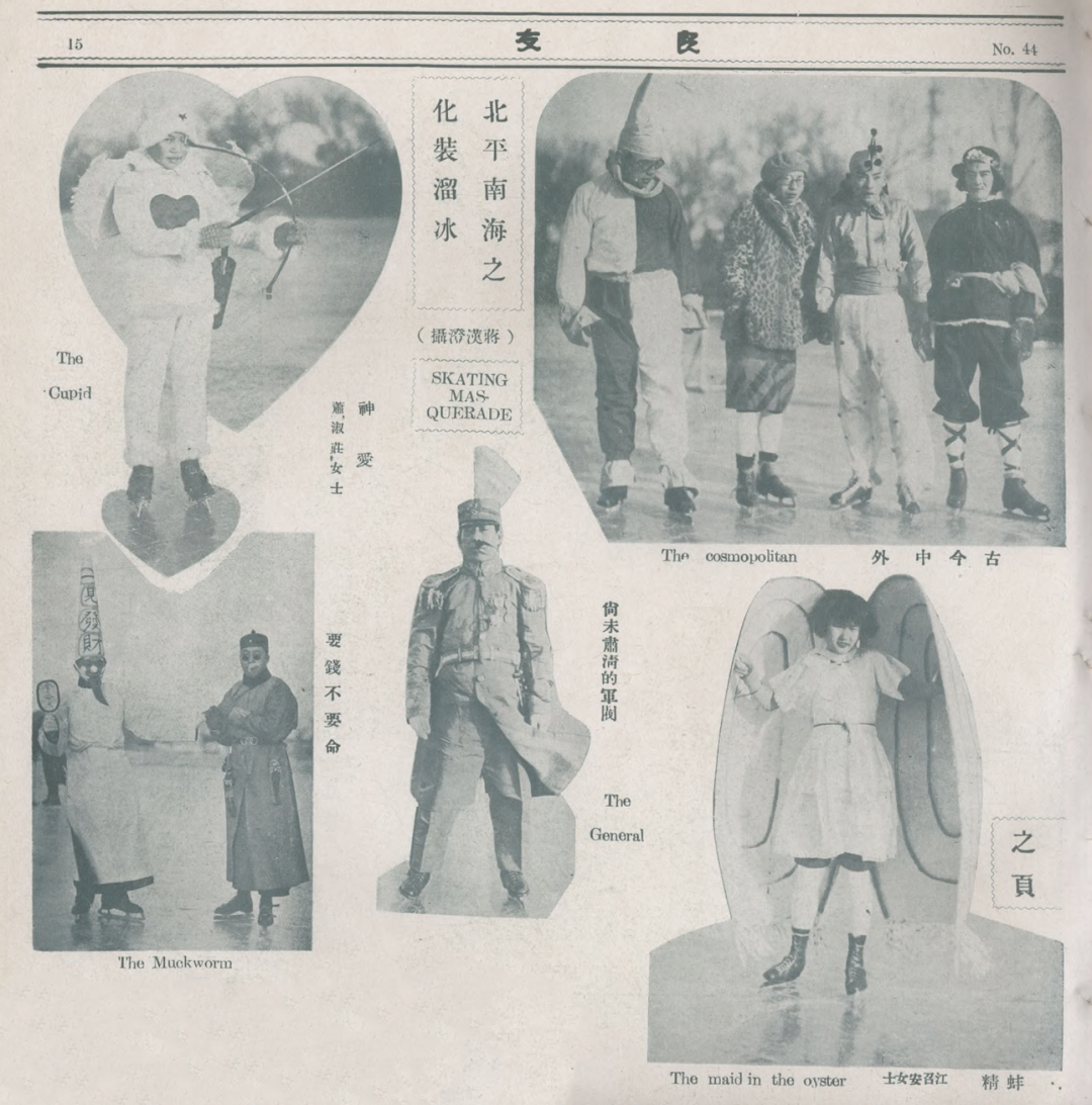 《晨报》报道过1926年冬天北海公园的一次化妆溜冰活动:北海漪澜堂的经理广约中外人士,组织竞赛,只要异装参赛就有奖品,所以参与者高达一百三十多人。比赛当天简直是大型cosplay现场,“西妇方面,除九人饰牛马羊或兔令人捧腹不计外,中妇方面服装奇妙,尤以粤人张女士之饰蝴蝶,及某女士之饰印度妇,尤为妙绝。男人方面,有某君所饰欧洲七代之武士,又有饰莲花游船等,亦均有可观。”这些文字,今日读来,仍然意趣横生,让人心驰神往。