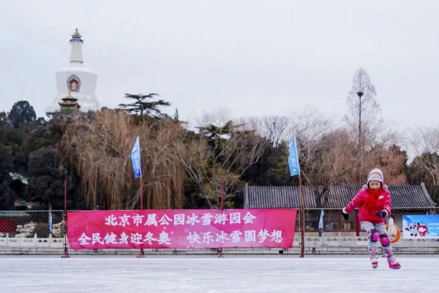 如今的北海公园在冬季依然有冰场,位于公园南岸的荷花湖,为了安全起见,每年要确保冰层达到15厘米以上才能开放,还有专职测冰员,每天填写测冰记录,及时掌握冰层和水位的变化情况。去年,北海的冰场1月8日开放,时值北京冬奥会,冰场上还布置了不少冬奥相关元素。在滑冰的身影活跃在冰面上之前,湖面则是野鸭子们的乐园。
