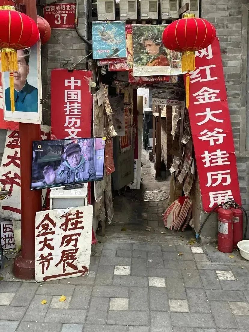 小店很不显眼,没有门脸,路边一间大杂院,左拐第一间光线昏暗的小屋就是。面积顶多十几平方,墙上是挂历,桌上是台历,地上还堆了不少进货的箱子。76岁的店主金安光坐在门口,有人过来打望,他就主动问一句,“找挂历?”他自知多多少少算个网红,还很自得的在门口摆了台显示器,循环播放电视台采访他的画面。
