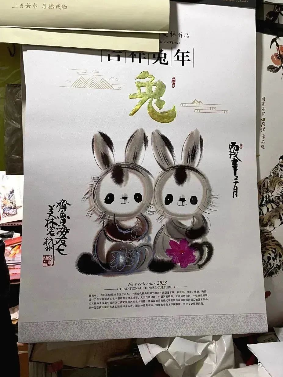 老金告诉我,现在卖得最好的是生肖挂历,明年是兔年,所以小店里兔子主题挂历格外多,最抢手的是大师韩美林的兔子画,小一点尺寸的已经售罄,现在只剩下大号的了。但并不是每年的生肖卖得都好,老金说,狗年借个“旺”字,牛年有“牛气冲天”,虎年“虎虎生威”、龙年“龙飞凤舞”,但猪年、蛇年就差点意思,顾客们宁愿买风景画。