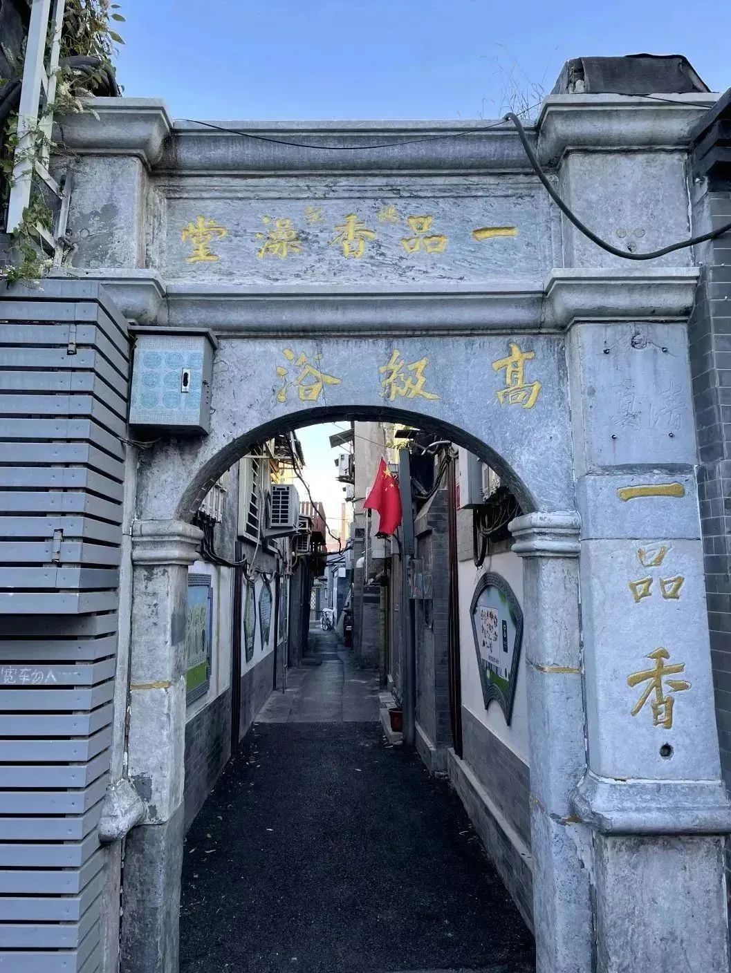 夹道北口门首有一块石刻牌匾,上有隶书“一品香澡堂”五个金字,下面的石拱门上则有“高级浴”三个字。历经风吹日晒,石墙已经尽显沧桑意味,但几个金字熠熠生辉,为近年所补。
