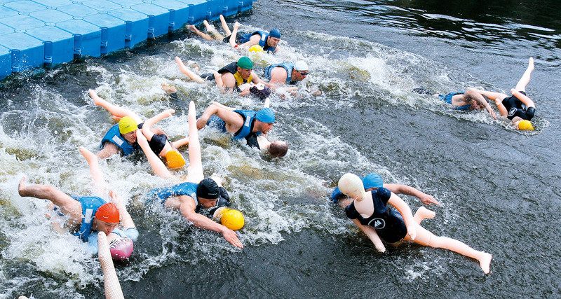 5月27日,立陶宛首都维尔纽斯在涅里斯河举行2011年梭鱼比赛,约20名男子携带充气娃娃游完了半公里泳程。 )