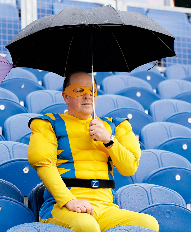 5月23日,在英国威尔士加的夫市斯维尔克体育场,英格兰和斯里兰卡的比赛因雨推迟。看台上身着超级英雄服装的板球迷们正在喝饮料,当天是国际板球赛第一场测试赛的第一天。 )