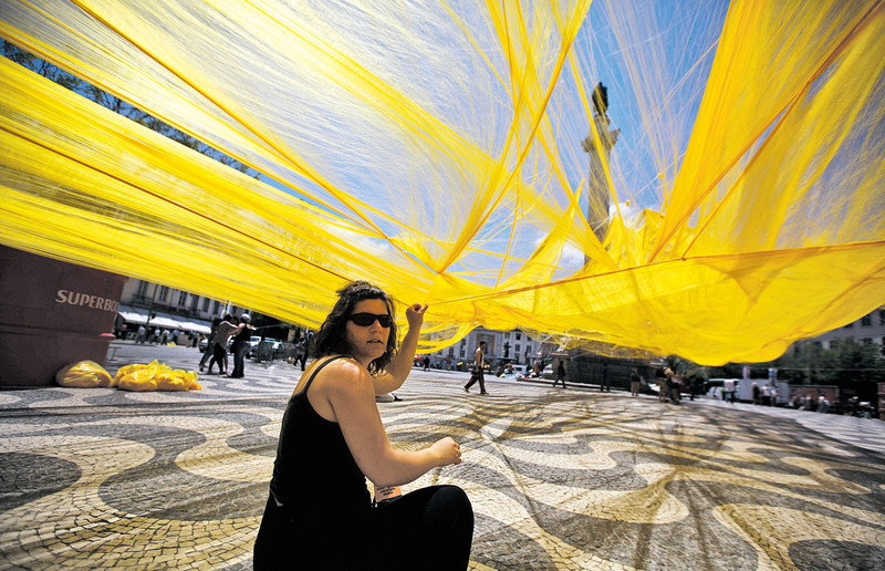 5月31日,葡萄牙里斯本,整个罗西欧广场被一张黄色的网盖上,这是意大利艺术家多纳托·萨托瑞的装置艺术“城市面具”的一部分。 )