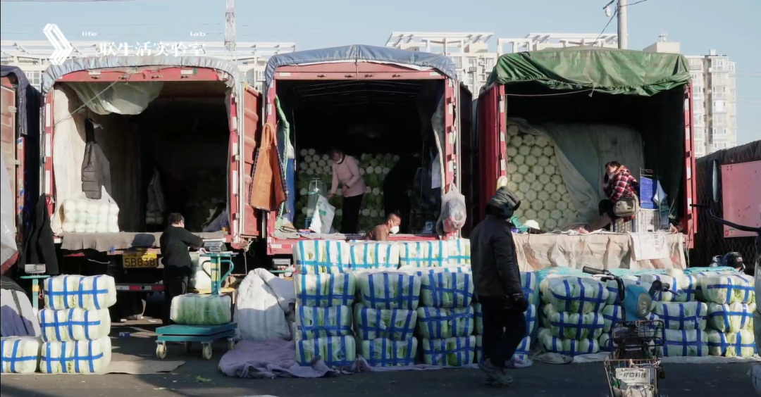 我们先去了北京的新发地,这里是北京市民的菜篮子,供应了市面上95%的白菜。上万斤白菜堆在空场上。在这里,白菜是山,也是海。