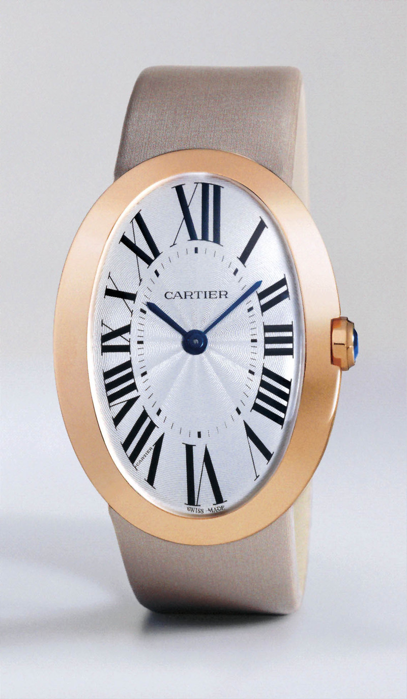 日内瓦表展上卡地亚Baignoire腕表的新版本,雅致的设计来自它的几何形状和柔和的色彩搭配。拱形的椭圆在这里纵向伸展,表盘细节包括笔直的罗马数字装饰、放射状线条和点线组成的刻度轨等。腕表用18K玫瑰金表壳配银色瓷釉雕纹装饰表盘,搭载了430MC手动上链机械机芯。■ )