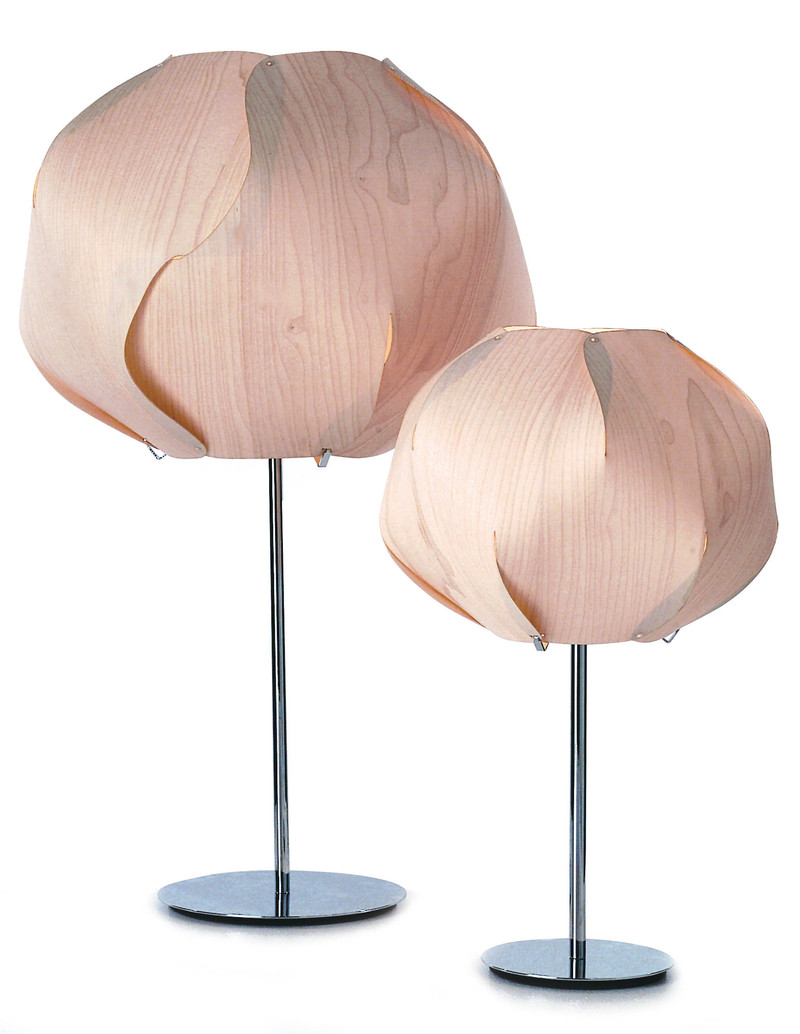 意大利设计师玛塔丽·克拉塞特(Matali Crasset)把枫木皮和编织布料用在一起,变成这个Evloute桌灯,立杆部分是银色、草绿或者灰色金属。灯罩可以自己拆卸组合,木片有布一样的韧性,弯曲时不易断裂。光源穿透木片的时候,可以看到它的木纹,柔暖的光线也把自然的感觉带入房间里。■ )