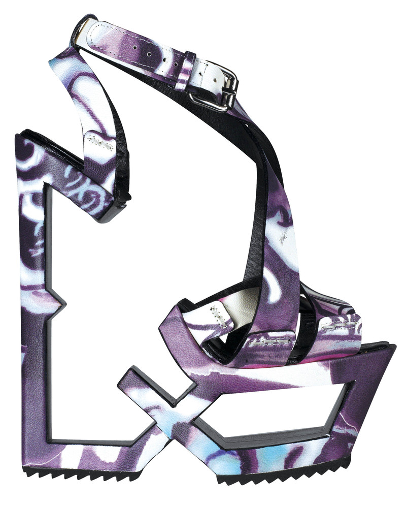 Celine的设计师称这个鞋底造型来自非洲安达布拉的母系部落,那里的人用这种图案装饰屋子,现在被转变成了Kiraro鞋的超高鞋底。几乎被抽象化的楔形高跟鞋在中间形成十字交叉,依靠前掌和后跟的支撑来保持平衡,印花皮革的抽象图案也是来自非洲的部落。■ )