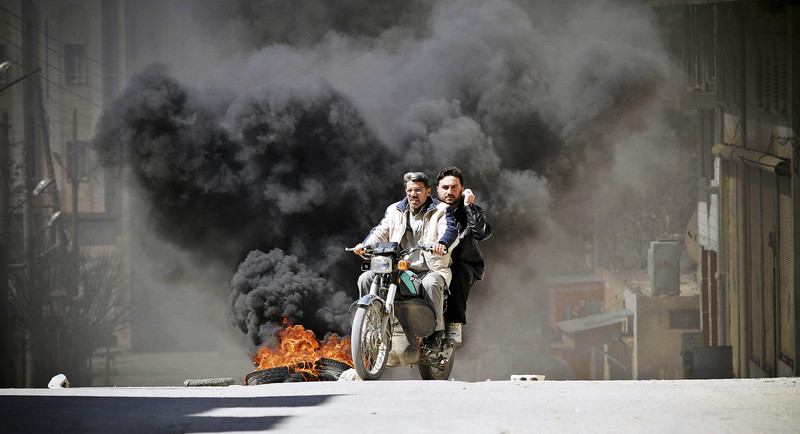 ( 4月9日,叙利亚政府军对Saraquib市区发起进攻,反政府武装燃烧轮胎以降低市区的能见度。图为两名叙利亚人骑摩托车逃离该区域