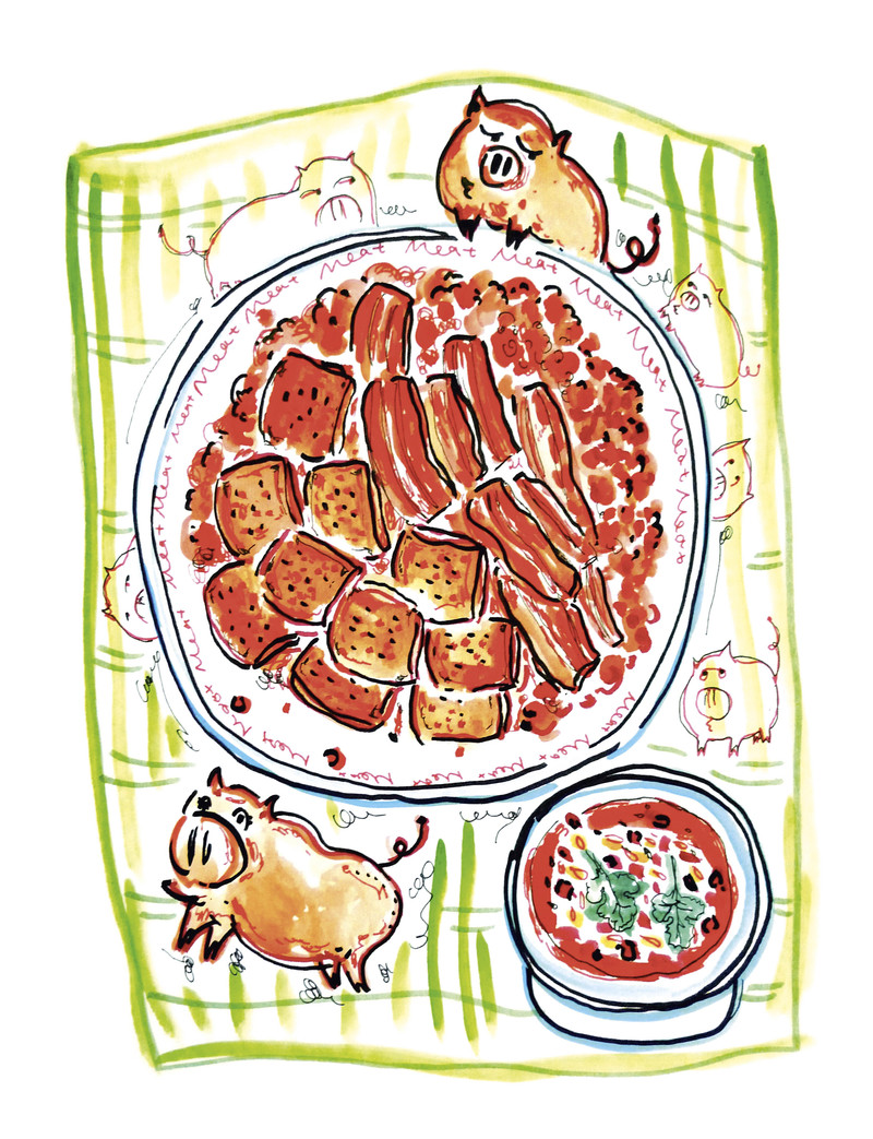 看不到生皮的制作过程,光听老板说,也觉得原始气息十足,颇有点意思。每天宰猪之后,把整猪用稻草盖住,直到熊熊火苗把整头猪都烤成黑色。之后要用井水冲洗猪的全身,再用刀刮去所有焦黑的部分,继而再冲洗一遍,猪的全身方才露出被火烤得金黄焦嫩的模样来。这时候才开始开膛破肚,取出内脏,猪肉和猪皮也一并被卸成几大块,等待着人们来大快朵颐。而其中最美味的要数猪后腿的瘦肉,由于在猪皮之下,所以虽经过了火炙,但仍然是粉嫩粉嫩的颜色,切成细丝,跟炖梅、辣椒、花椒、胡椒、蒜泥、细葱、芫荽一起调制而成的酸酸辣辣的蘸水同食,肉嚼在嘴巴里,弹性十足,但又柔嫩细滑,味重的蘸水既掩盖了些许肉的生腥气,又更突出了生肉的鲜味,是生皮中最讨人喜欢、容易让人接受的一种。