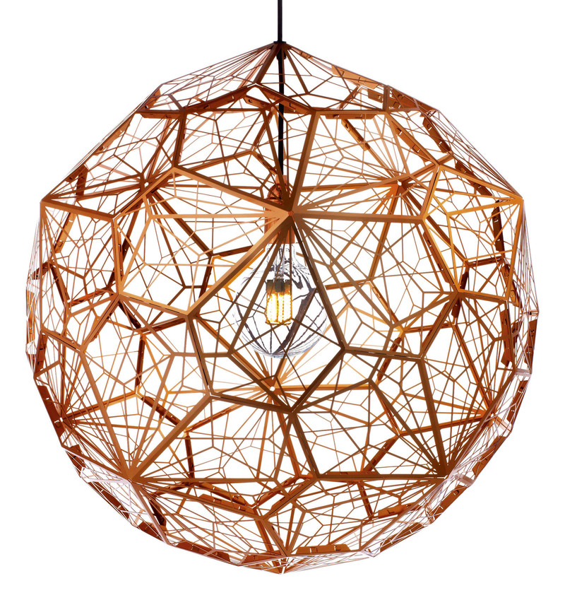 汤姆·迪克森设计的“蚀刻网络”吊灯,看似复杂的黄铜灯罩总共由60个不规则的五边形组成,制作中使用了生产电子产品的工业化方法,可以直接在金属上切割出细致的花纹。复杂的网状结构用数学方法计算,尤其考虑了灯光点亮时所投下的阴影。