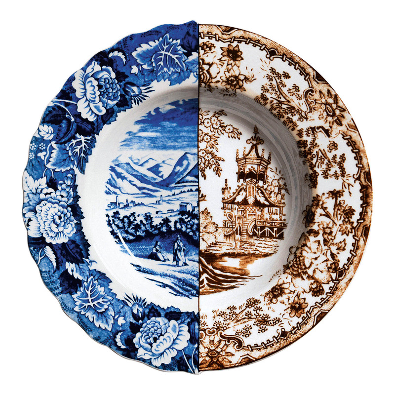 Seletti的“混合汤盘”在唐山用中国的骨瓷手工制作,试图反映出中国和欧洲骨瓷的制造历史。汤盘的装饰一分为二,不同的场景和主题被并置在一起形成新的混合,也体现了东西方的不同审美。