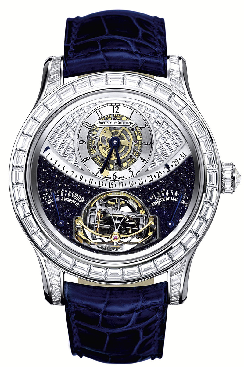 积家Gyrotourbillon I球形陀飞轮腕表I将日期刻度由左至右分列于表盘,日期的标示由两枚回跳式指针所分担。表盘设计以简约为主,常年月份与动力储存显示不喧宾夺主,以突显球体形陀飞轮摆轮与擒纵结构本身的美感。