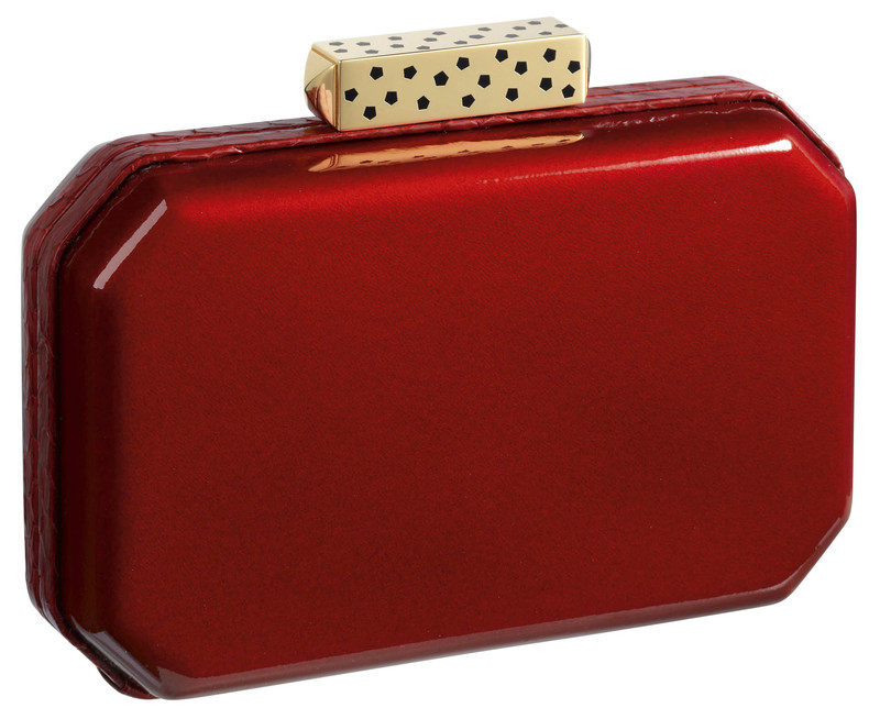 卡地亚晚装包用红色漆面结合方整的几何造型,简洁之中具有华丽感。金属包扣饰选用品牌经典的扭索饰纹装饰,上面缀以黑漆的五角图案斑点。