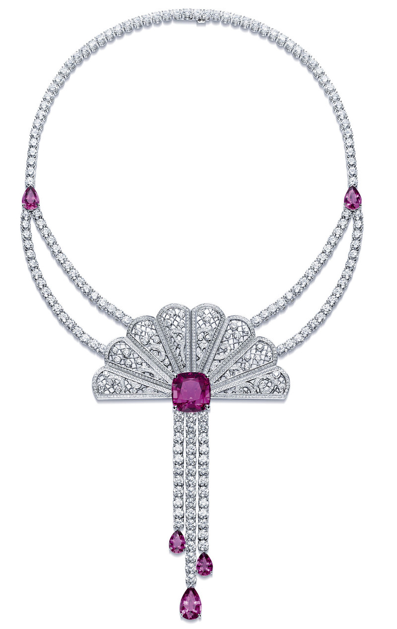 伯爵璀璨华裳系列中的钻石项链受古典折扇的启发,中央是一块雕刻细腻的红碧玺,映衬着扇形的网状饰纹。为了表现出折扇特有的开合效果,每个叶片都是分别镶嵌完成的。