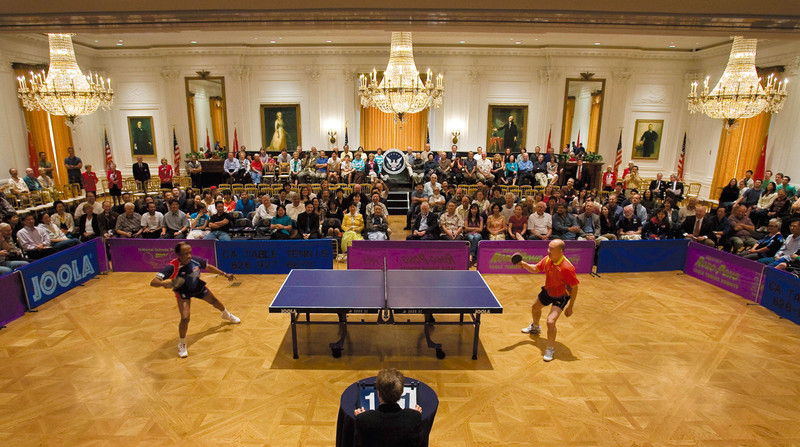 时光倒回37年前,处在“冷战”中的人们不会想到:几个球拍和乒乓球以及十几个乒乓球运动员会成为打开一扇外交大门的钥匙。但是1971年4月在中国进行的一系列乒乓球表演赛却改变了西方公众对于中国的看法,为中国重新回到世界舞台提供了契机。作为对当年“乒乓外交”的纪念,今年6月12日于理查德·尼克松图书馆重现了这一幕,部分当年亲身参与了“乒乓外交”的老队员们重新上场。■