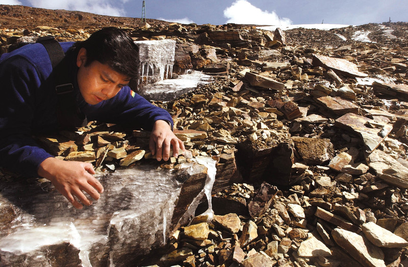 ( 2004年12月,玻利维亚冰河学家拉米雷兹在察看已融化的恰卡塔雅热带冰川