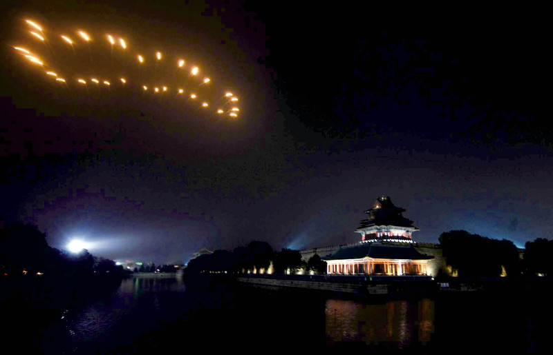 在电视机前最能感受这串脚印的奇妙,航拍画面上,它们左右分明,构成了有节奏感的行走动态,真的就像一步步“走”到了“鸟巢”上空。这奇妙的创意来自蔡国强,这位张艺谋导演团队中的视觉特效总监,渴望用不一样的方式点亮开幕式的夜空,把整个城市当作一个焰火的舞台。蔡国强设想中的一串脚印,对于传统的焰火造型是一个巨大挑战。